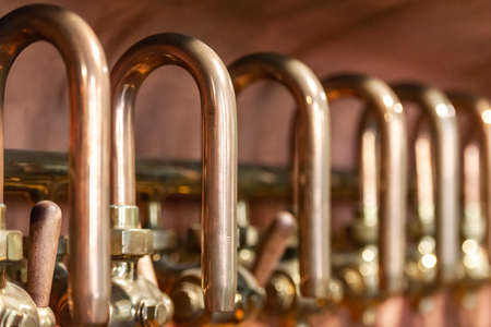 Copper pipes and levers. Part of the device at the beer factory. Taps for beer tasting.