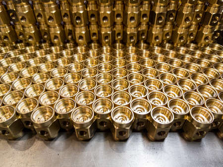 Shiny yellow metal parts background. Shiny brass metal threaded hexagonal parts after turning and machining.