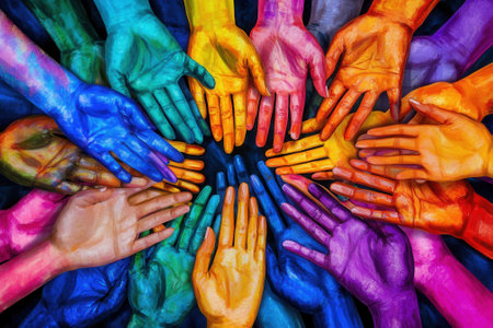 Five vibrant painted hands raised in fists symbolize unity, strength, and diversity, set against an abstract colorful background.