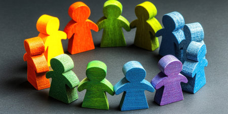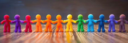 vibrant array of colored figurines stands together hand-in-hand, global unity, human rights or corporate inclusivity, equality, and mutual respect in social campaigns or educational materials