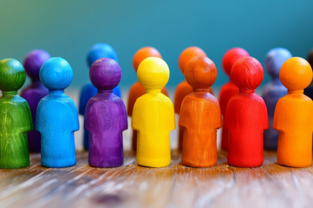 Wooden figures painted in rainbow colors standing together, symbolizing diversity, inclusion, and equality