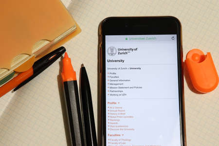 Los Angeles, California, USA - 7 December 2019: Mobile phone screen with University of Zurich website page close-up. Higher education admission and overview concept, Illustrative Editorial.