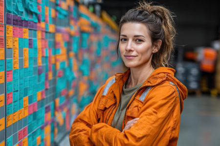 A confident logistics worker orange jacket stands front of colorful planning board, symbolizing efficient operations