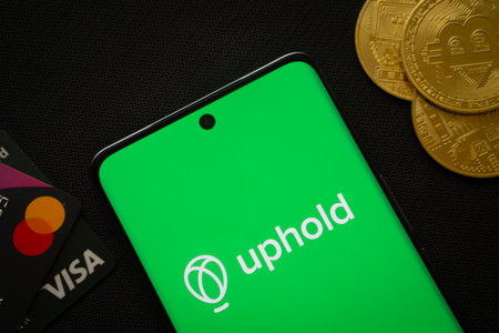 Dhaka, Bangladesh- 03 Sep 2025: Smartphone displaying Uphold logo surrounded by Bitcoin coins and payment cards.