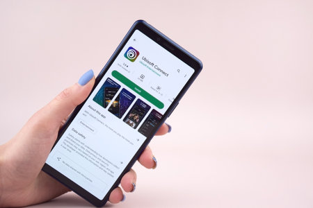 Kazan, Russia - Apr 15, 2022: Ubisoft is French video game company. Smartphone with Ubisoft logo on screen in clenched hand on background of Ubisoft logos.