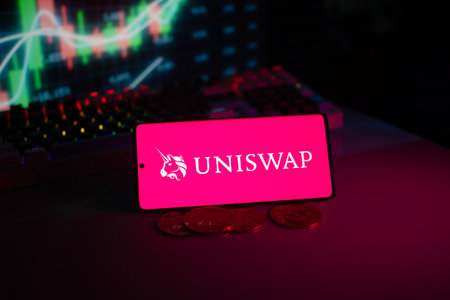 Dhaka, Bangladesh 18 September 2025:Uniswap logo on smartphone with coins and stock chart, highlighting digital finance and trading