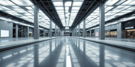 Ultra-Wide Empty Exhibition Loft with Dynamic LED Grid Ceilings - Matte industrial flooring, massive open loft space, digital LED ceiling