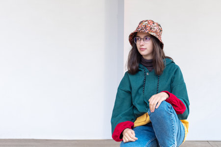 Portrait of a teenage girl in a bright multicolored jacket, jeans and hat on a light background. The girl looks at the empty space. A place for your text.