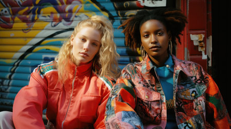 A stylish duo in oversized denim and bold graphic tees, exuding confidence and creativity against a colorful graffiti backdrop