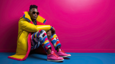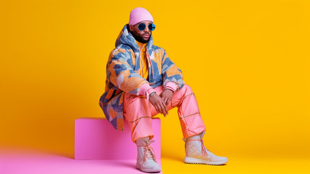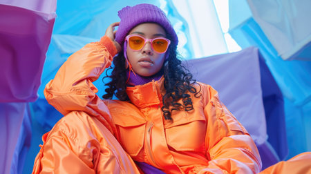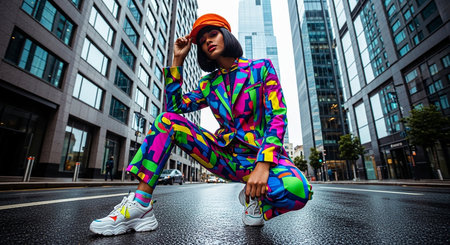 Stylish Young Woman in Trendy Streetwear Against Vibrant Background