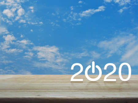 2020 start up business flat icon on wooden table over blue sky with white clouds, Happy new year 2020 concept