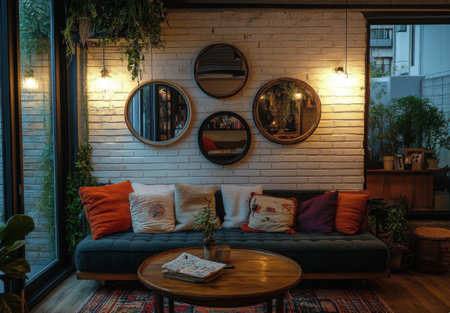 A stylish living room showcases a comfortable sofa adorned with black and beige cushions. The brick walls, modern mirrors, and rustic coffee table create a warm ambiance.