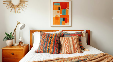 A cozy bedroom scene with vibrant geometric art, patterned pillows, a stylish lamp, and a touch of greenery creating a perfect relaxing ambiance. Generated A.I.