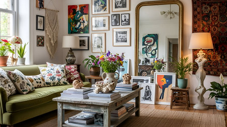 Maximalist Gallery Wall. A vibrant and eclectic living room where the focus is a floor-to-ceiling gallery wall. It features a