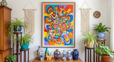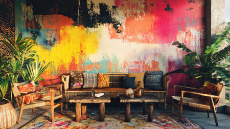 A vibrant living room featuring an abstract wall art with bold colors, rustic wooden furniture, and lush indoor plants, creating a warm and inviting atmosphere.