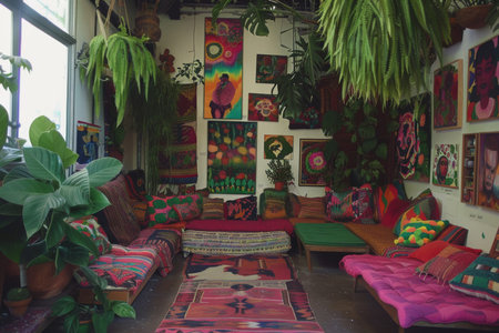This image depicts a lively and colorful living room adorned with eclectic decor. The room features a variety of vibrant cushions on the sofa, numerous framed artworks on the walls, and an assortment of potted plants. A wooden coffee table sits in the center, surrounded by comfortable seating arrangements. The space is further enhanced by a large area rug, vintage furniture, and warm lighting from table lamps.