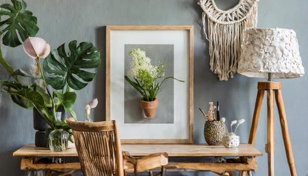 Design home interior of living room with stylish chair and wooden desk, plants, flowers, table lamp, mock up poster frame, macrame and elegant accessories. Stylish home decor