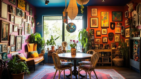 Interior design inspiration of Bohemian Eclectic style home dining room loveliness decorated with Wood and Textile material and Gallery Wall .Generative AI home interior design .