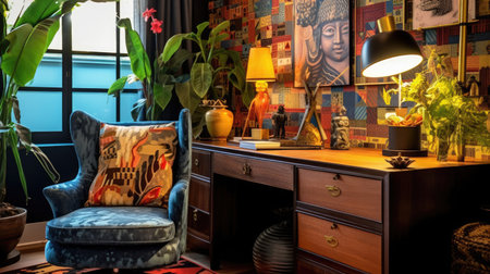 Inspiring office interior design Eclectic style Study Room featuring Mix of patterns architecture. Generative AI AIG 31.