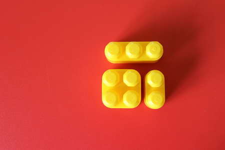 Colorful plastic blocks over white paper background. Plastic children's toy