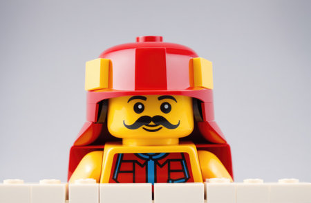A yellow minifigure with a red helmet, mustache, and blue shirt smiles from behind a white wall