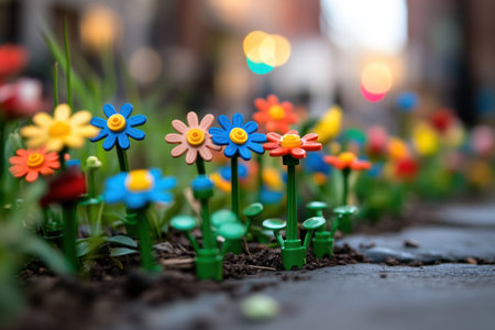 In the style of LEGO, create an ultra-realistic photograph of colorful flowers growing on a dirt path in front of local stores during springtime with depth of field. The focus is sharp and detailed. Canon EF 24-70mm f/2.8L IS USM --ar 3:2 --v 6.1 Job ID: 28a1f216-aee7-47fd-a3c9-66e2ae2ff7de
