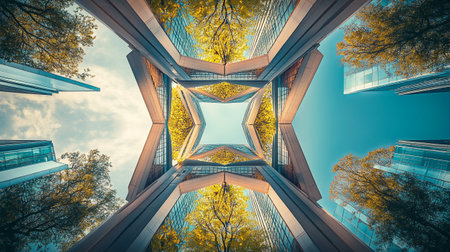 underside panoramic and perspective view to steel blue glass high rise building skyscrapers, business concept of successful industrial architecture
