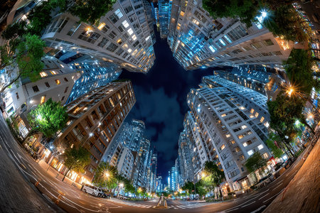 Fisheye lens view of city buildings at night