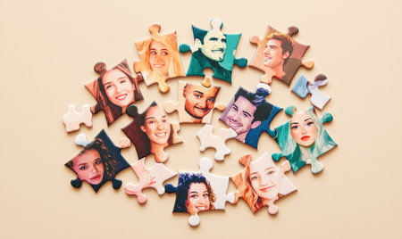 Puzzle pieces showcasing diverse faces, representing connection and community through portraits, ideal for themes of diversity, unity, and collaboration