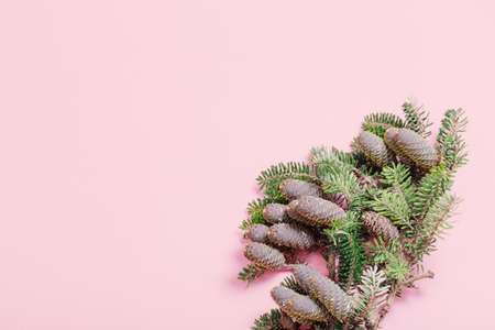 branch of fir with cones on pink background