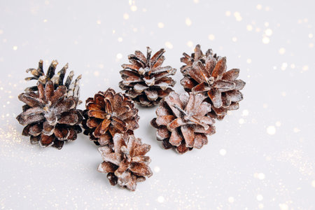 Pine cones with shimmer and lights on a white background. Christmas background, top view