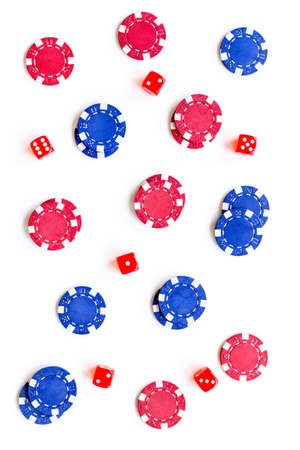 Casino dice and chips on a colored background, poker, gambling with bets. Dice and chips as a background for your design