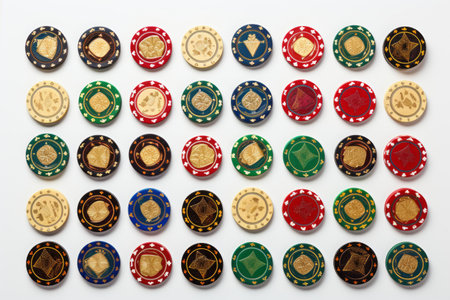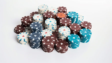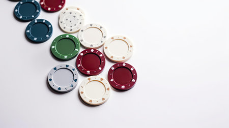 Colorful Casino Bliss: A Top View of Diverse Chips on a White Canvas
