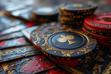 Colorful Antique Gambling Coins and Vibrant Casino Chips Elegantly Arranged on Game Table Display