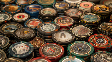 A vibrant assortment of casino chips, showcasing an array of intricate designs and colors. Perfect for visuals related to gaming, luck, or nightlife themes.
