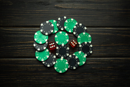 Green and black chips from a successful combination in a game of dice or craps. Low key concept of a gambling and popular game.