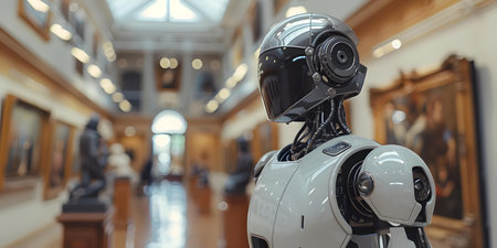 A futuristic android appreciates fine art in a contemporary gallery space. Concept Artificial Intelligence, Technology, Fine Art, Contemporary Gallery, Futuristic Android