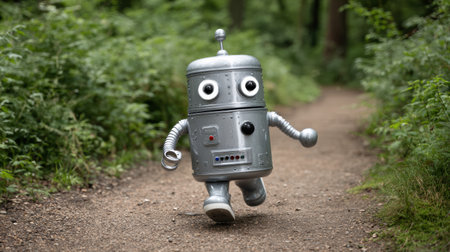 A cheerful robot runs along a wooded trail, surrounded by lush greenery and sunlight, showcasing a playful exploration of nature.