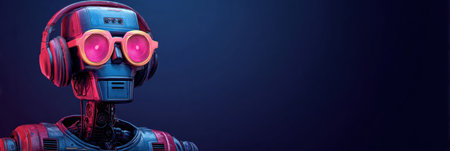 A robot DJ, equipped with luminous shades and headphones, energizes the crowd with electronic music at a lively night event.