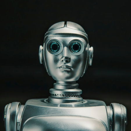 A robot stands thoughtfully against an orange background, equipped with glowing blue eyes
