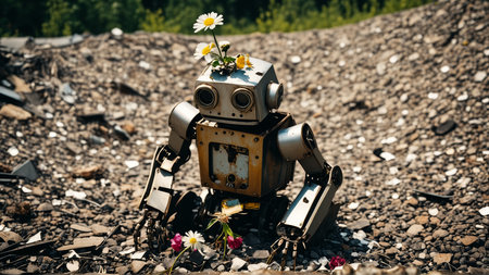 A toy robot sitting on the ground in the woods. Generative AI image.