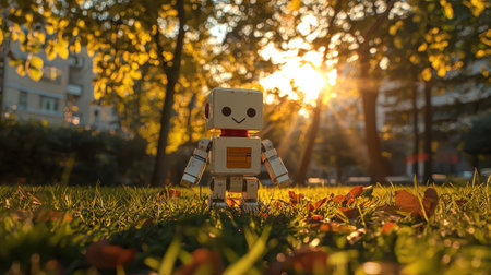 Charming robot toy standing in a sunlit park surrounded by colorful autumn leaves under a warm glowing sunset in nature scene