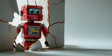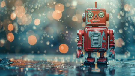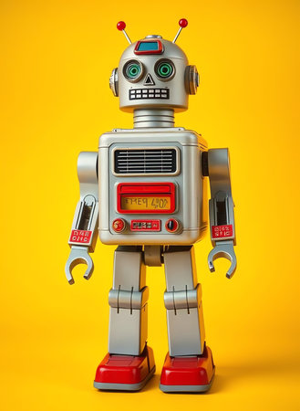 A charming vintage robot toy with dials and buttons displays a colorful exterior on a bright backdrop.
