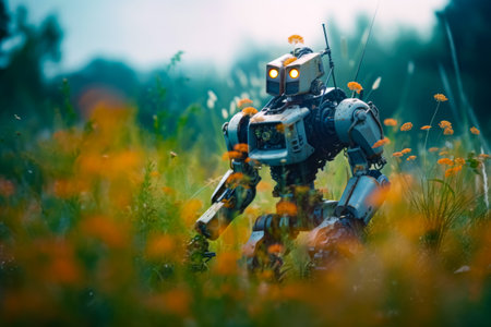Robot that is standing in the grass with light on it's head. Generative AI.
