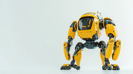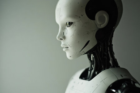 A humanoid robot with intricate details stands in a clean, minimalist space, highlighting its design.