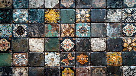 A vibrant arrangement of colorful vintage tiles showcases a rich mosaic pattern, ideal for backgrounds or decorative elements in design projects.