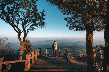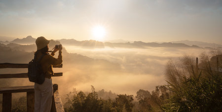 Tourism vacation and travel. A tourist taking photo of beautiful sun rise at mountain landscape at sun rise time with mirrorless camera at Doi Ang Khang, Thailand