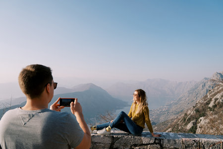 Guy takes a picture of girl sitting on a fence over a bay in the mountains. Back view