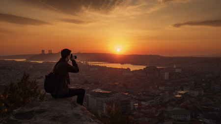 Photographer taking picture of cityscape at sunset, Istanbul, Turkey