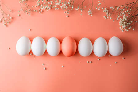 Bright red Easter egg among white ones on a pastel background. Festive spring greeting card